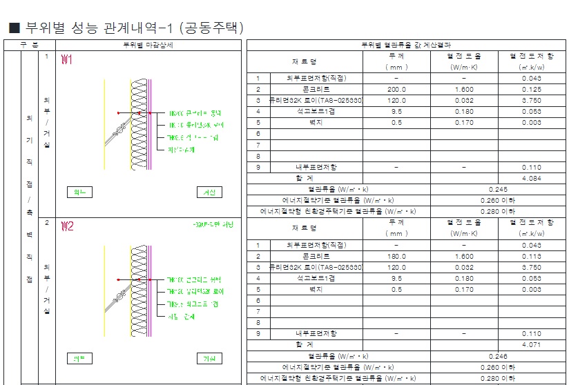 되게 복잡하게 빼곡히 숫자가 적혀 있는데, 단순히, 법에서 정한 열관류율보다 적게 설계하기 위한거다.