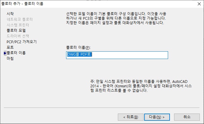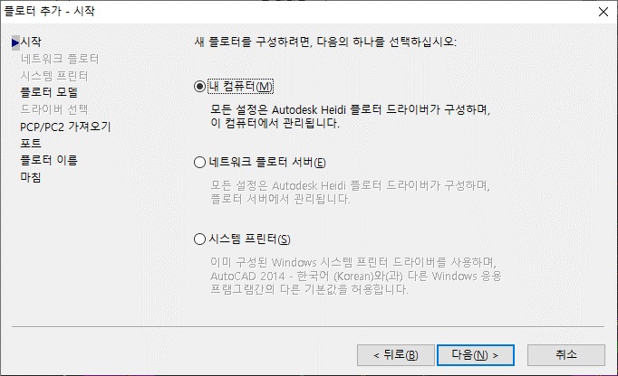 그럼 플로터 추가 대화 상자가 나오는데, 주저리 주저리 길게 적혀 있다.