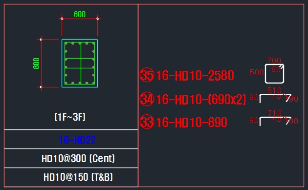 33번 보조대근은 기둥의 세로가 800인데, 890이다. 와우! 이건 10%도 넘게 차이난다고 호들갑 떨 필요 없다.