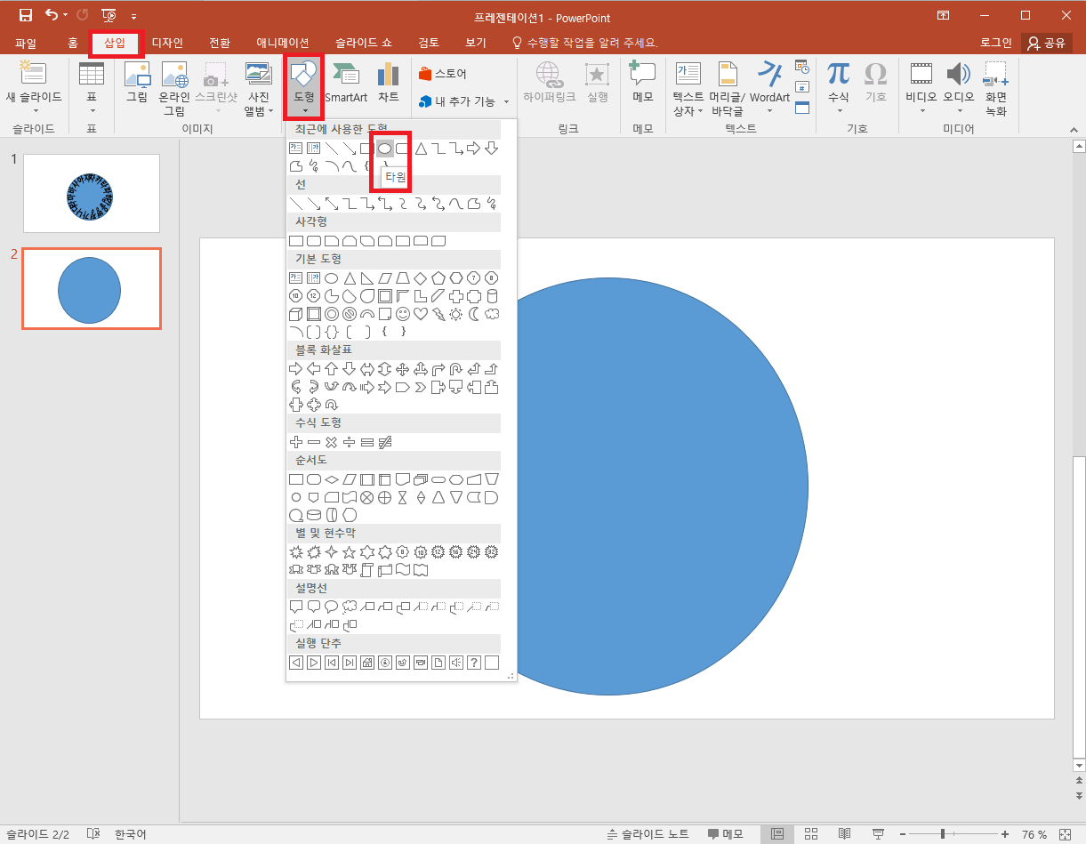 다시한번 말하지만, 이과정은 필요 없다. 하지만, 정말 동그랗게 쓰였는지 확인차 도형을 삽입하고서,