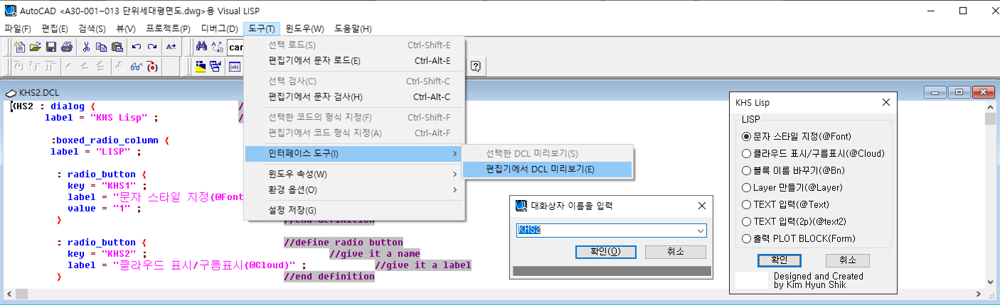 "도구\인터페이스 도구\편집기에서 DCL 미리보기" 실행하면