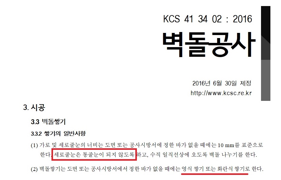 또, "벽돌 쌓기는 도면 또는 공사시방서에서 정한 바가 없을 때에는 영식 쌓기 또는 화란식 쌓기로 한다." 라는 시방은 왜 있는지 천천히 알아보자.