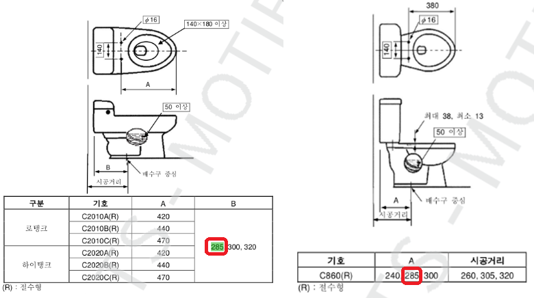 하지만, "시공거리"가 KS에서 정한 치수가 단1개가 아님으로 변기 교체시 필히 확인 하는 센스