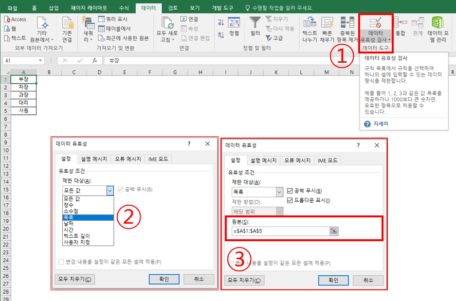 3. 목록의 데이터를 원본에 설정(여기서는 A1~A5에 부장~사원까지 선택할 값이 적혀 있음)