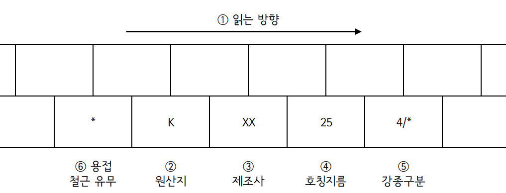 5 강종구분(예를 들면, SD300 : 표시없음, SD350 : 3 또는 *, SD400 : 4 또는 **, SD500 : 5 또는, ***, SD600 : 6 또는 ****, SD700 : 7 또는 *****)