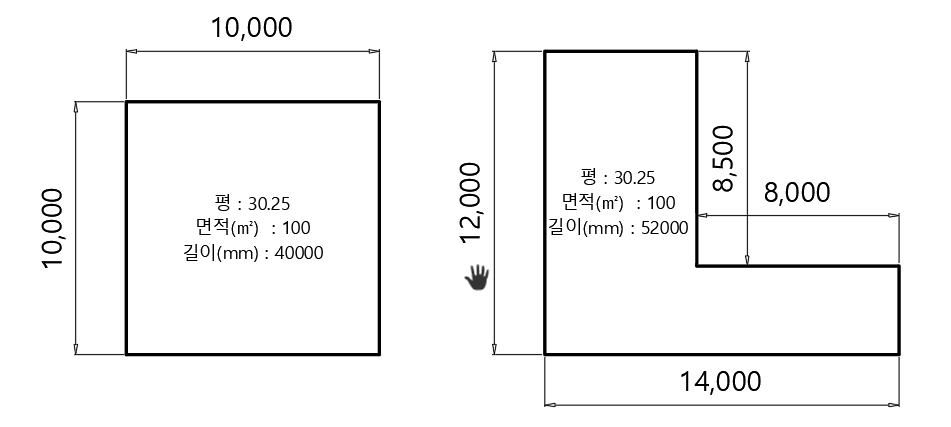 정사각형과 "L"형 모양의 사각형은 각각, 333.3미터와 333.36미터로 산출이 된다.