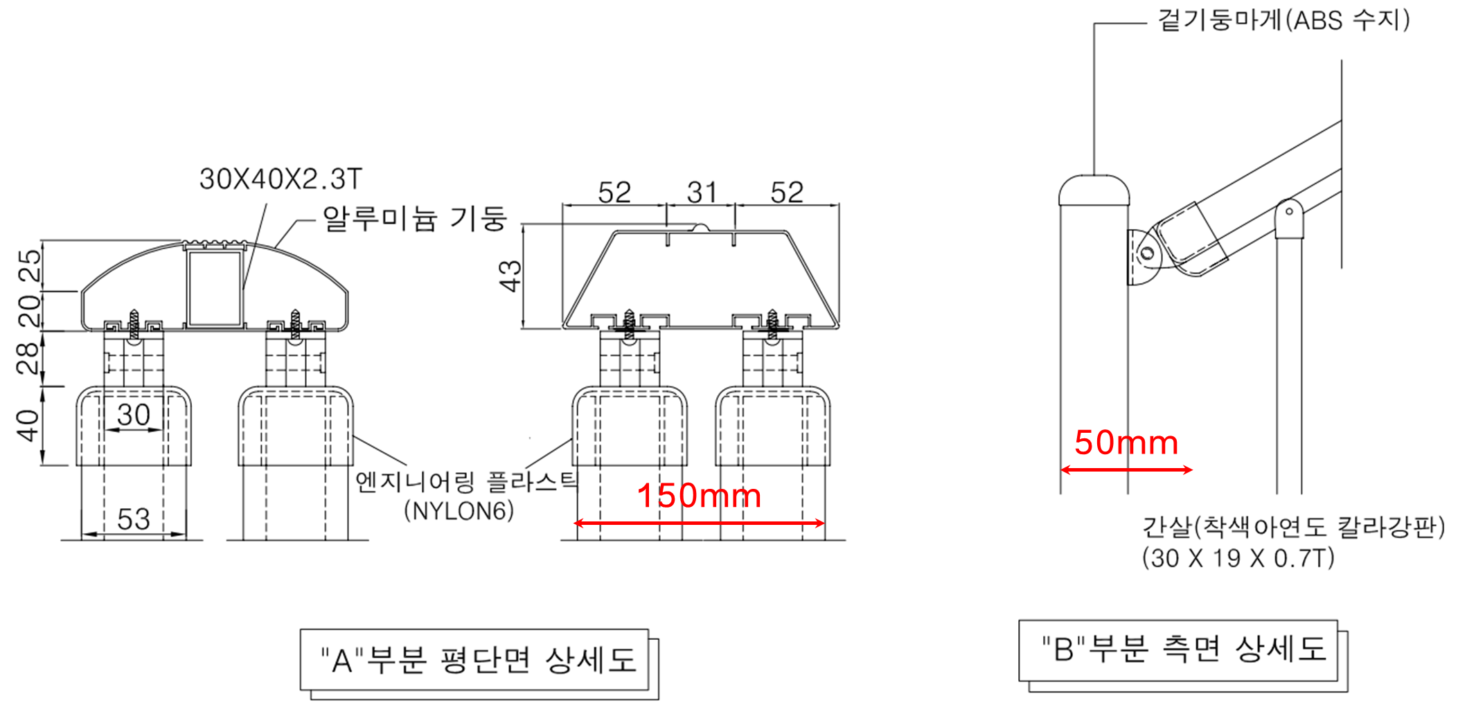 거기에, 난간대의 여장길이("B"부분 측면 상세도) 50+ 마구리면("A"부분 측면 상세도) 150 + 난간대의 여장길이("B"부분 측면 상세도) 50 를 구하고, 2를 곱한다.(계단참이 2번 생기니)