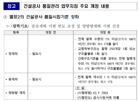 정/동재하 시험의 빈도를 전체 말뚝 수량의 1% 이상 시험으로 명문화