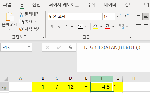 Degrees 함수와 ATAN 함수를 이용하는 거다.