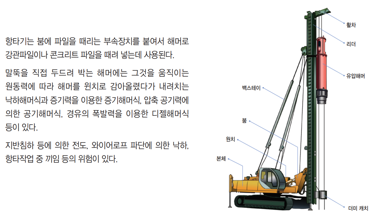 | 말뚝(항)을 때리는(타) 기계 = 말뚝을 박는데 사용하는 기계 | 구멍을 뚫는(천공) 기계 |
