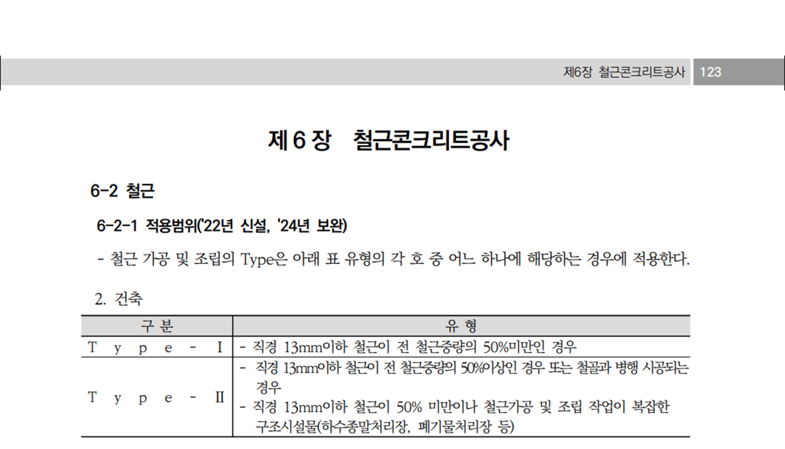 | Type- Ⅱ | >직경 13mm이하 철근이 전 철근중량의 50%이상인 경우 또는 철골과 병행 시공되는 경우 >직경 13mm이하 철근이 50% 미만이나 철근가공 및 조립 작업이 복잡한 구조시설물(하수종말처리장, 폐기물처리장 등) |