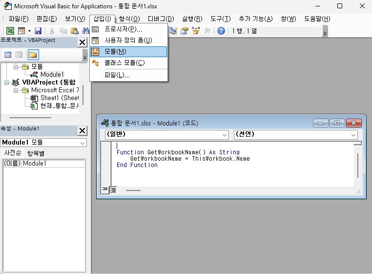 2. 메뉴에서 "삽입 - 모듈" 선택